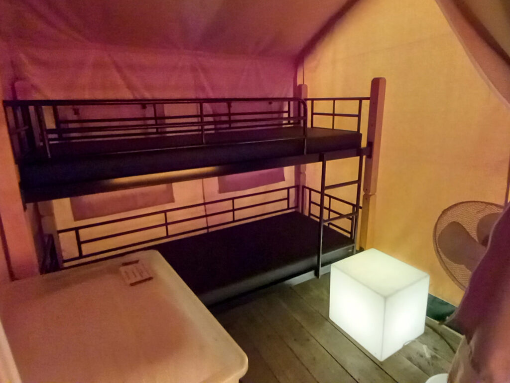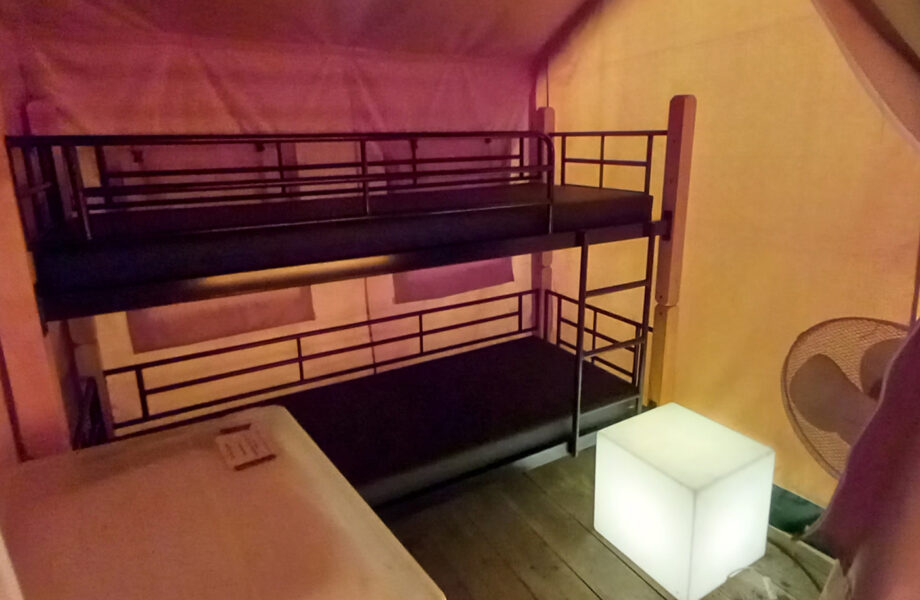 Achter in de tent zijn twee slaapcabines. In één slaapcabine een tweepersoonsbed, in de andere slaapcabine een stapelbed. De tenten zijn standaard uitgerust met kussens en eenpersoonsdekbedden (Hoezen, lakens en kussenslopen moet u zelf meenemen).