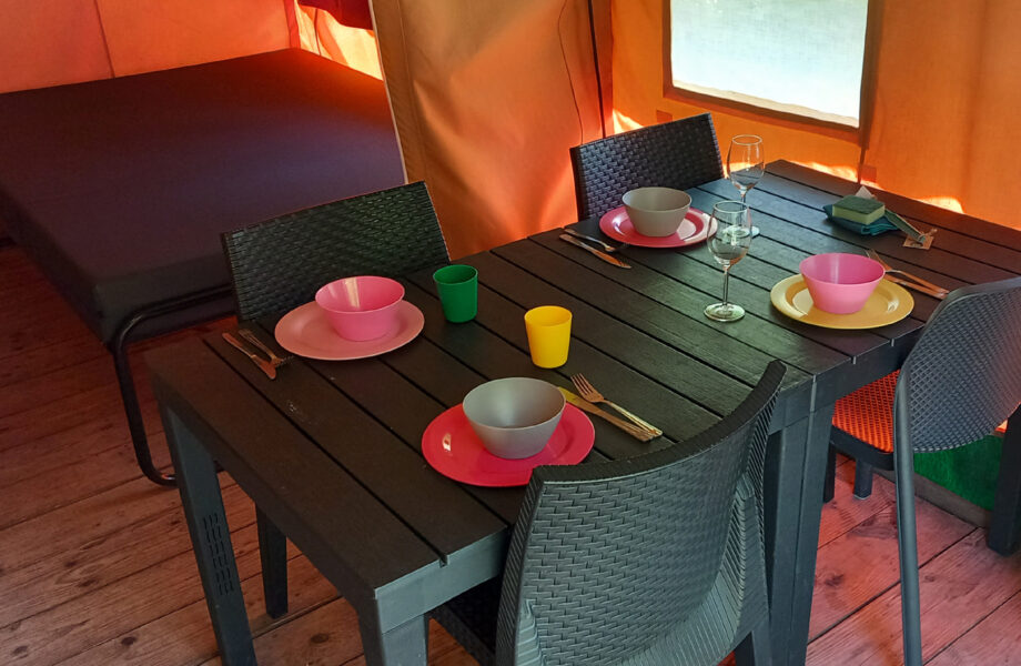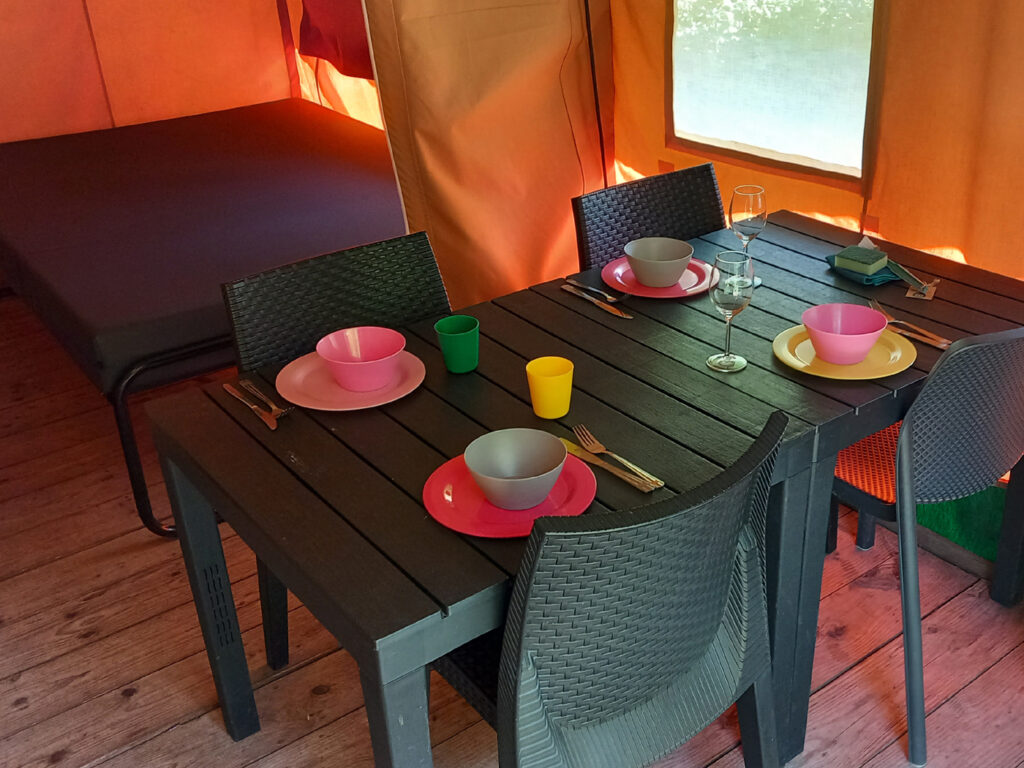 De 4-persoons safaritenten beschikken over een woongedeelte, keukentje en 2 aparte slaapcabines. De compleet ingerichte keuken met inventaris heeft een vierpits gastoestel en staat op wielen en is dus naar buiten te verplaatsen, zodat je gezellig buiten kunt koken! Daarnaast is de keuken voorzien van een koelkast, snelfilterkoffiezetapparaat en een waterkoker.